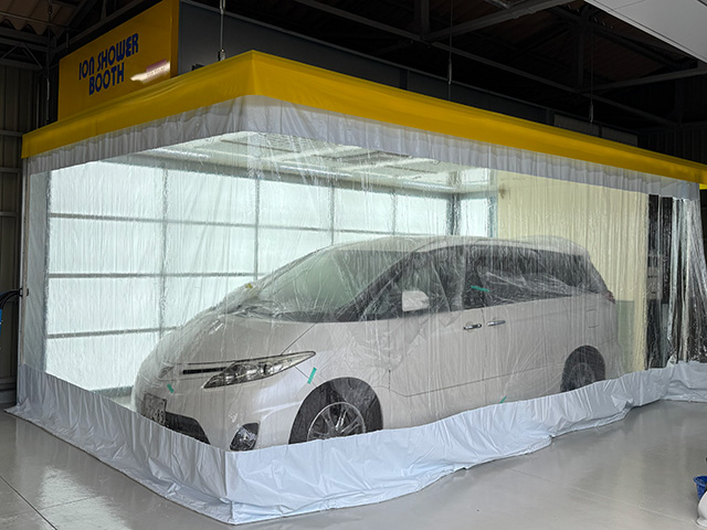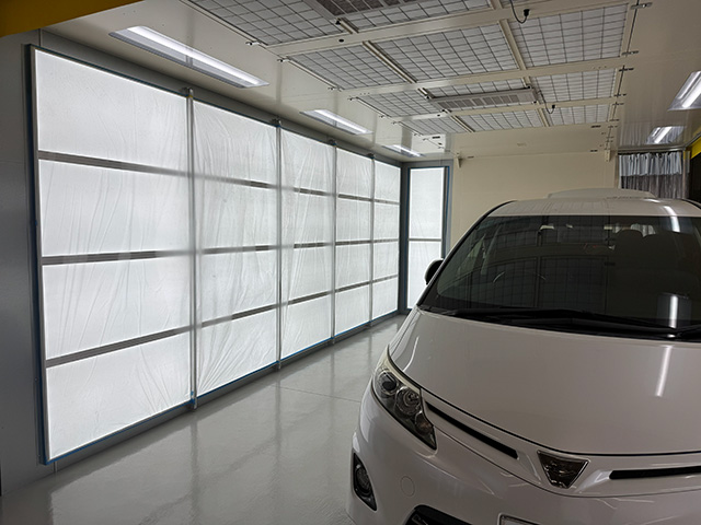 給気・排気ファンによる風量コントロールで塗装ミストの舞い上がりを制御し、専用ブースでゴミ・ホコリをシャットアウトして高品質な仕上りを実現します。