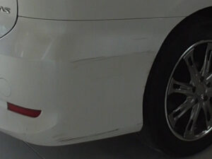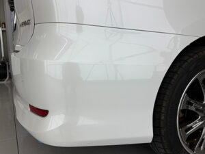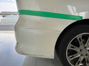 ひたちなか市にお住まいのA様より、トヨタ・エスティマの右後部にできた線キズの修理をご依頼いただきました。駐車場で柱に擦ってしまったとのことで、大部分にまたがる線キズが右後方部にかけて入っていました。ぱっと見は浅いキズでしたが、下地まで達している部分もあり、放置するとサビや塗装の浮きの原因になる状態でした。